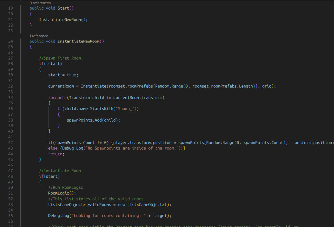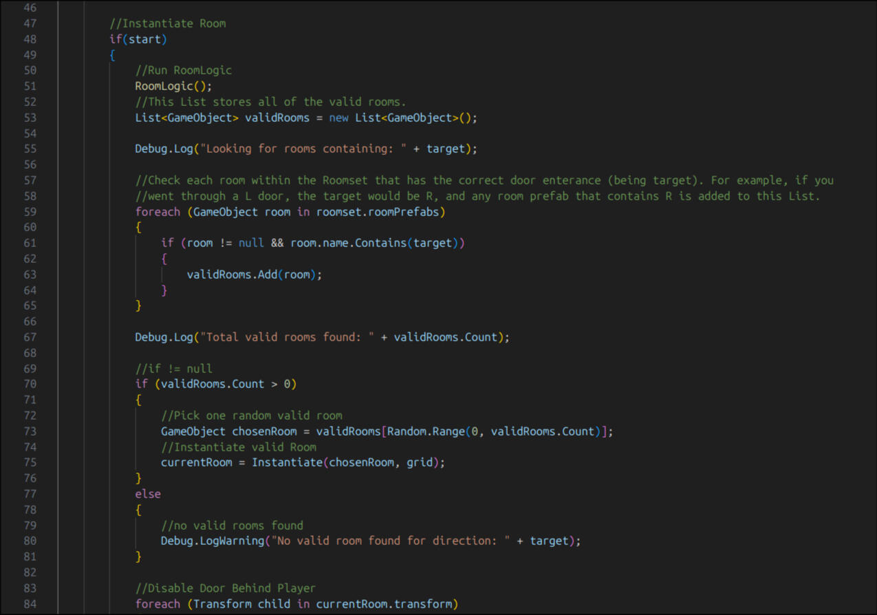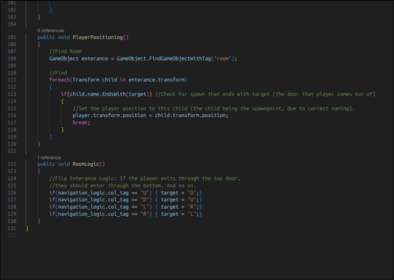How does my procedural generation system work?I've created semi-procedural level generation from scratch without much knowledge of how to approach a procedural generation system.The dungeon levels are not procedurally generated and instead are already premade (semi-procedural) which allows for more creative opportunities. All rooms contain a certain amount of doors which branch into other rooms. These dungeons are organised into categories depending on the nature of them (secret room, boss room, regular dungeon room). When the game is first started, an appropriate random room is instantiated at the centre of the world (0,0,0). Each door inside of a room is given a unique tag (#up, #down, #left, #right), which organises the location of all of the room exits.When the player collides with one of the doors, a transition animation is played and the old room is removed. A new room with is instantiated in the same position, and the player is teleported to the door with the opposite tag of the original door (#up -> #down). The new room that is instantiated has a check to make sure it has the opposite door of the original room (otherwise it would appear as if the player entered from a wall). The collider for the opposite door is removed. Chance is also utilised, with different chances to get a unique or boss room, and the percentage scaling as the player progresses for more rooms. This is also the same system for the exit room. This system is very lightweight and effective, however does not allow for the player to backtrack through the rooms.